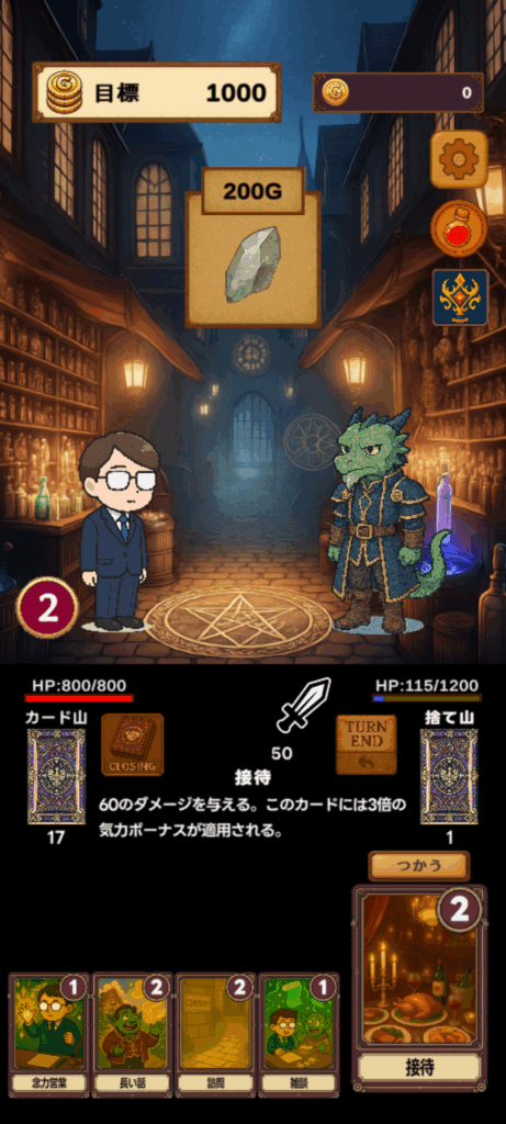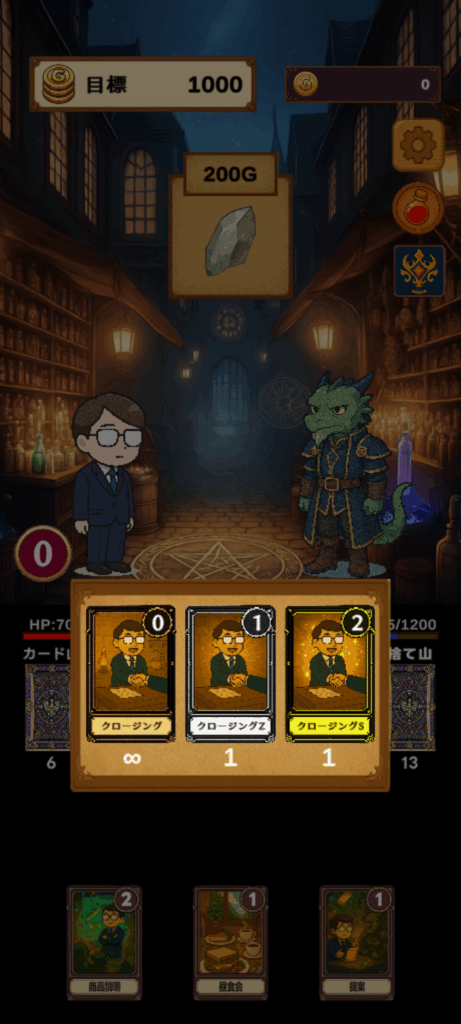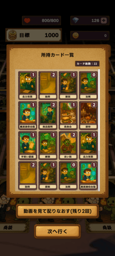 営業シーンではデッキの中からカードがランダムに配られます。