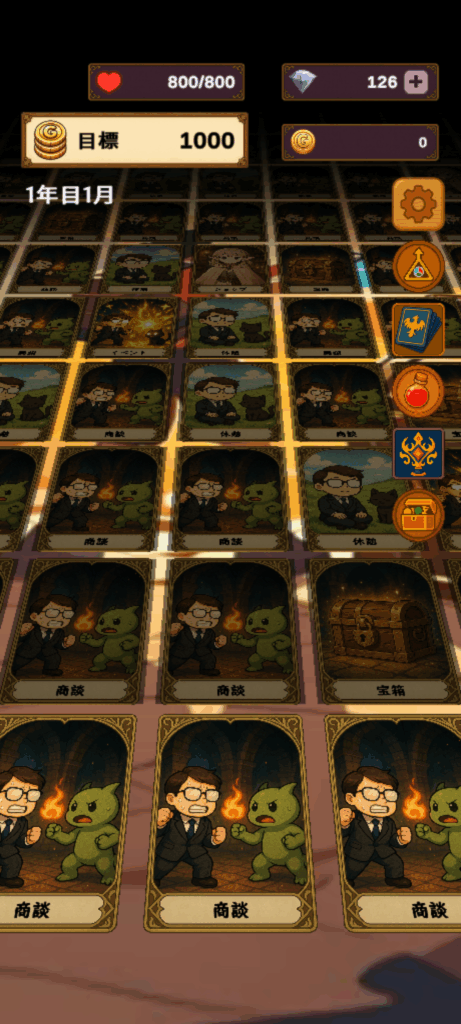 営業カードやイベントカード、宝箱カードなど好きなカードを選びましょう。残りHPには気をつけて!