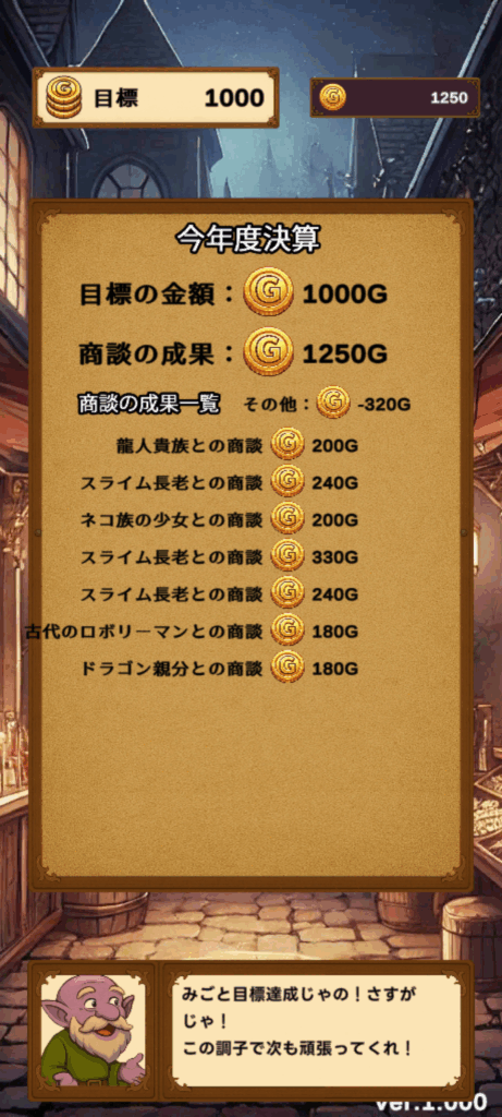 1年(12ターン)で一定の金額を稼ぐと次の年に進むことができます。